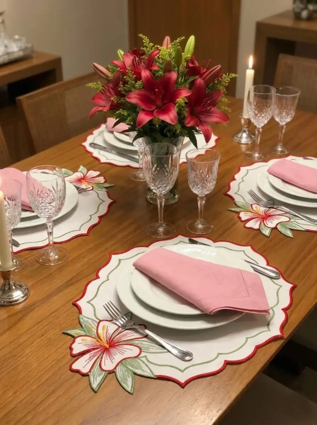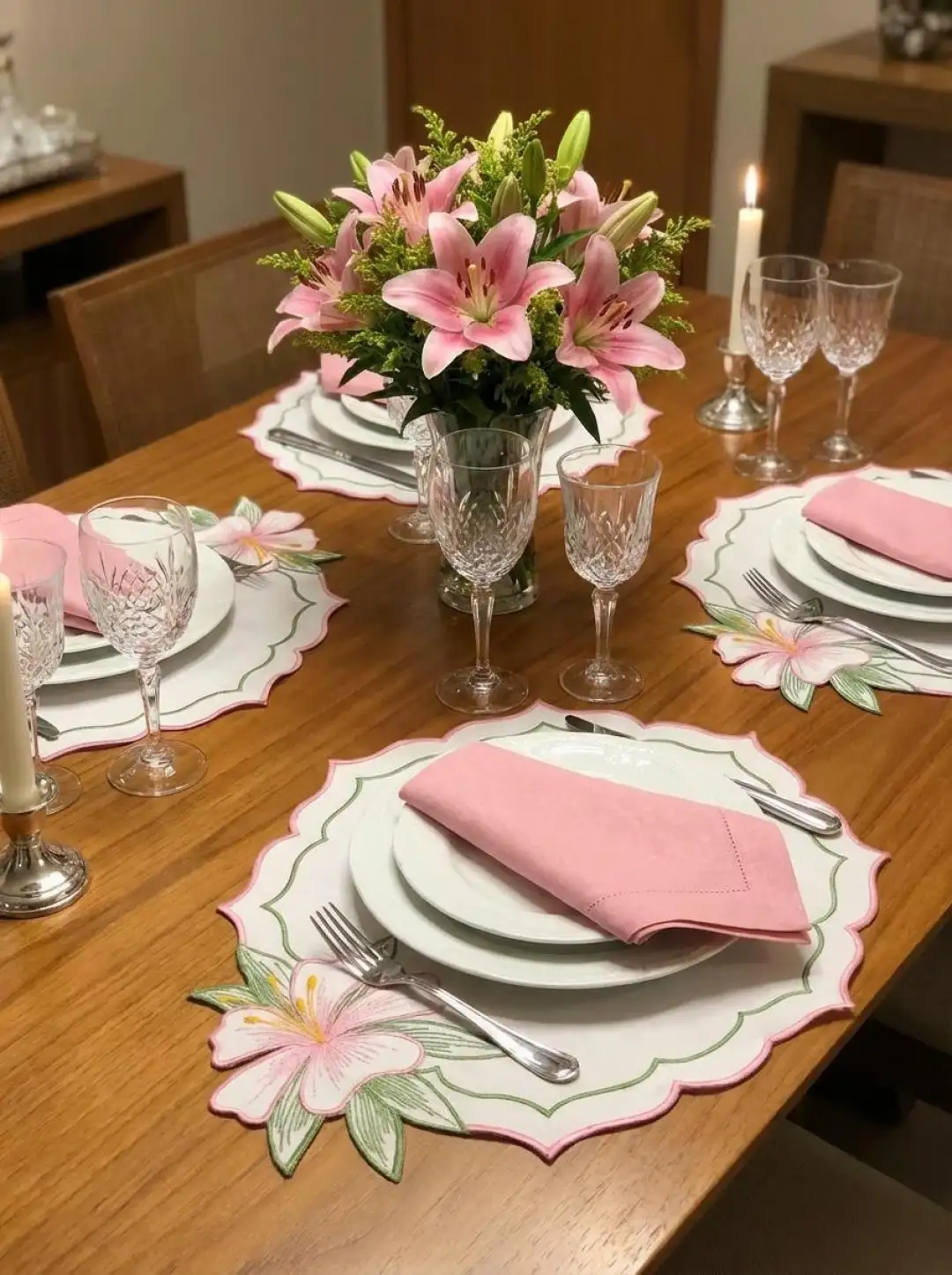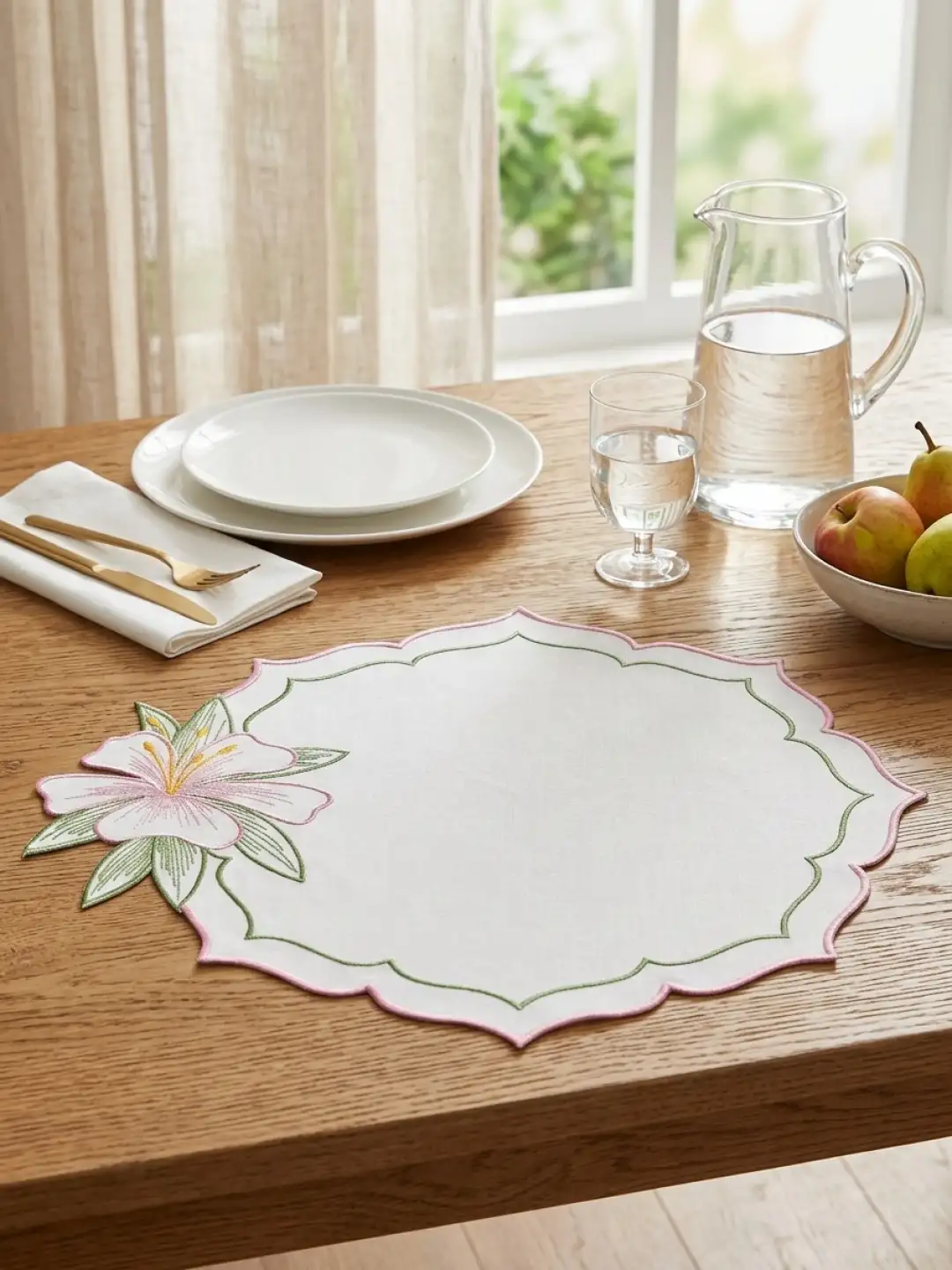 2 Kişilik Zambak Nakışlı Amerikan Servis ve Sunum Peçetesi Seti - 4 Parça Bahar Serisi