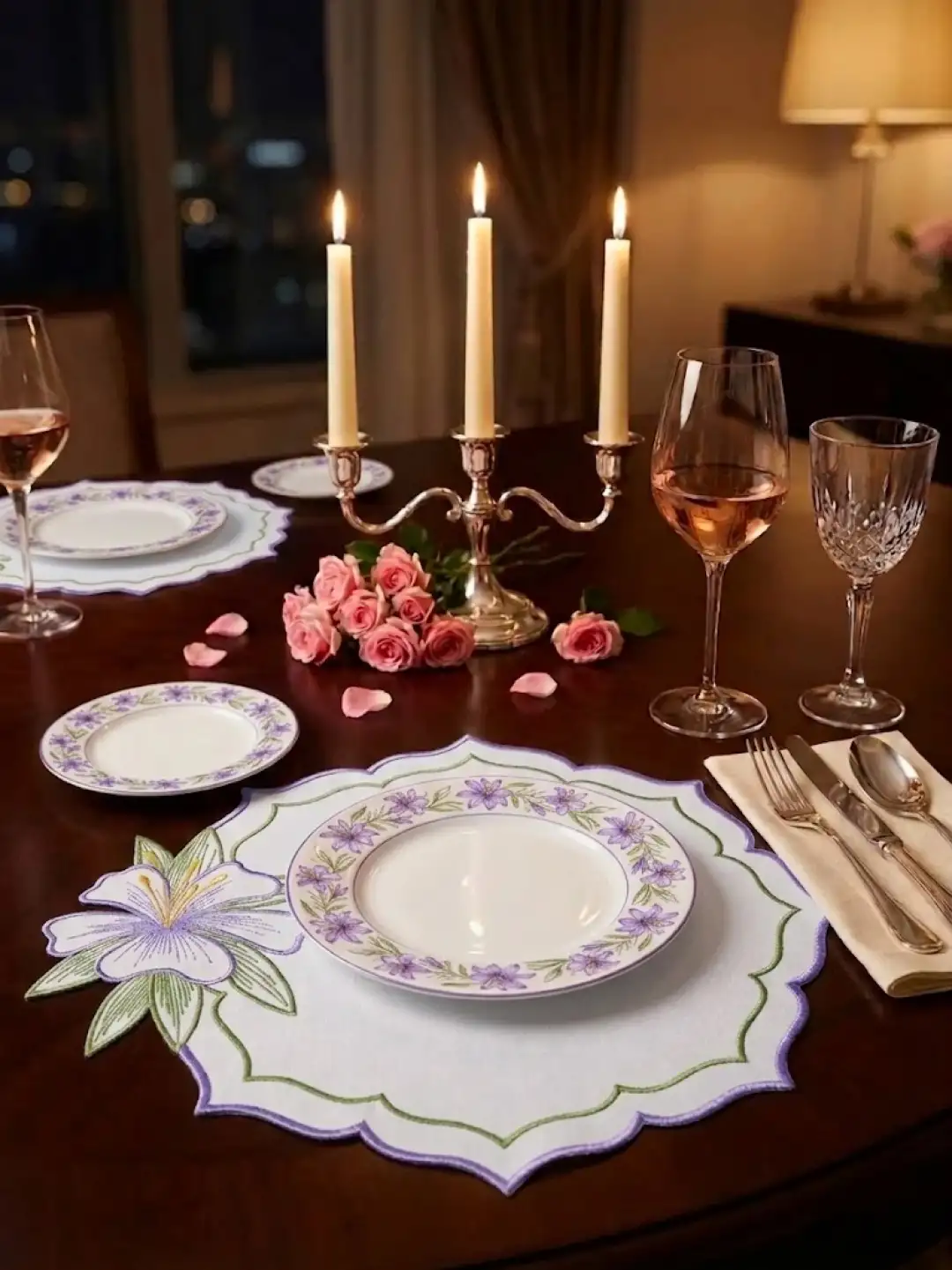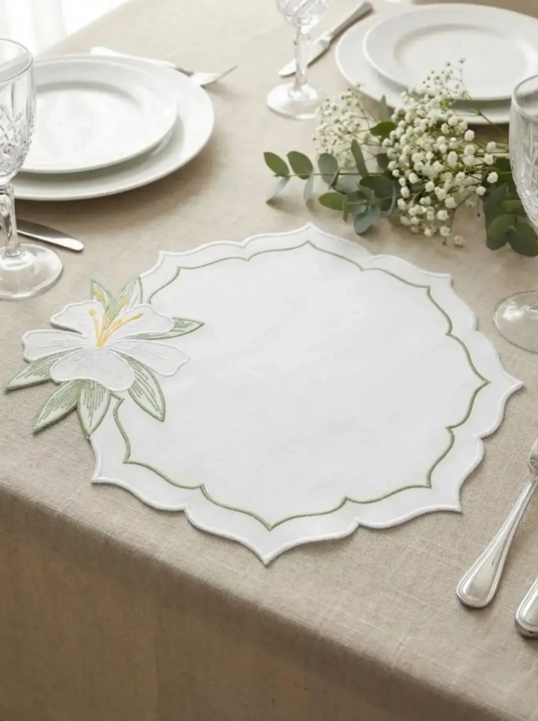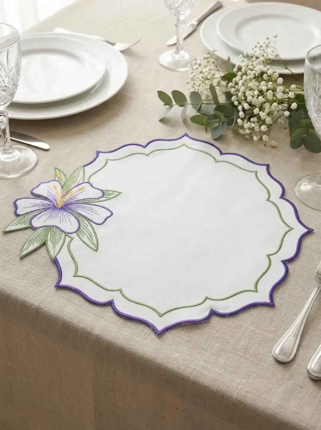 2 Kişilik Zambak Nakışlı Amerikan Servis ve Sunum Peçetesi Seti - 4 Parça Bahar Serisi