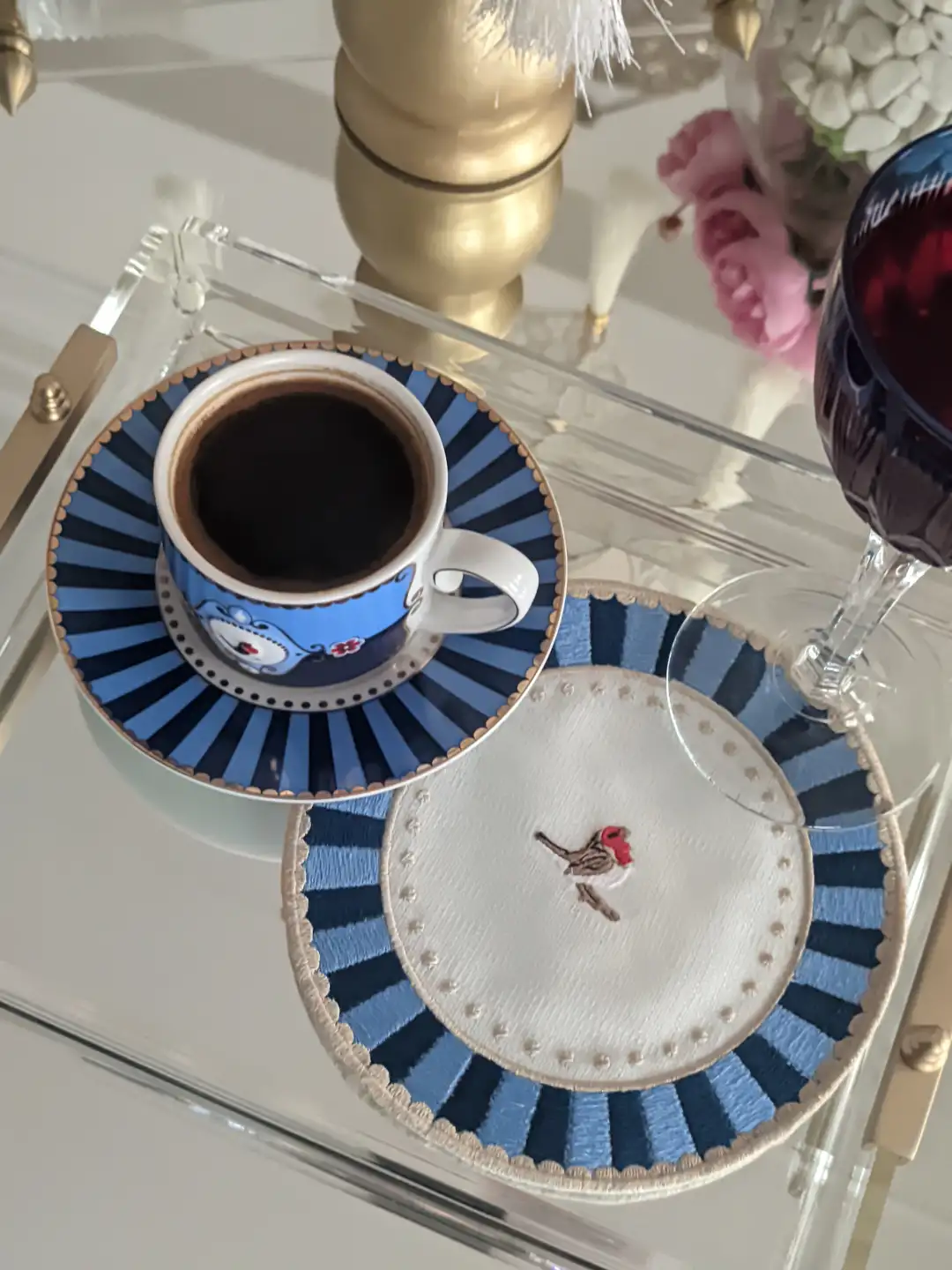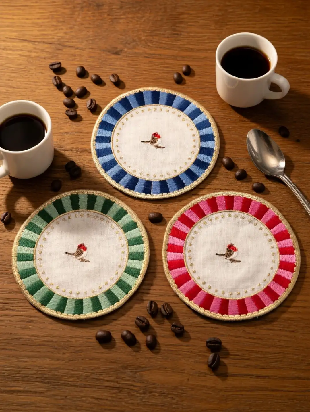 Sunumlarında kaliteye ve estetiğe önem verenler için tasarlanan mavi, kırmızı, yeşil nakışlı kuş desenli yuvarlak peçete, sofralarınıza zarafet getiriyor. İnce işçilikle işlenmiş kuş motifi ve etrafındaki altın rengi puan detayları, her bir parçayı özel kılıyor.