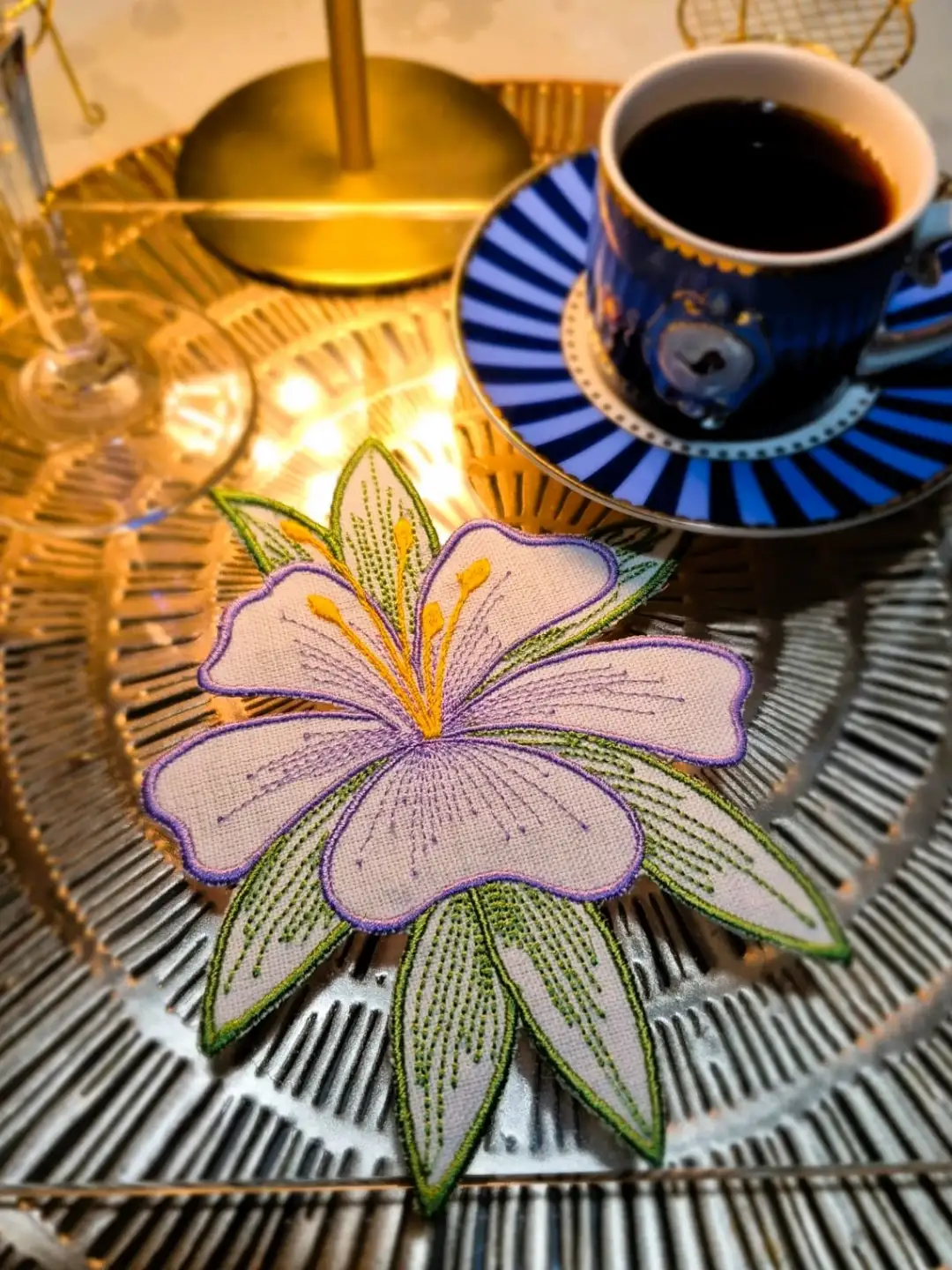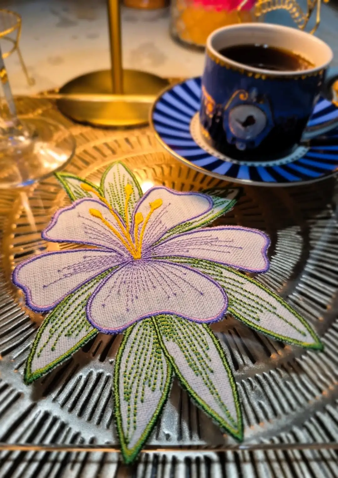 - Mor renkli zambak nakışları ile süslenmiş, şık ve zarif bir görünüm sunar.
