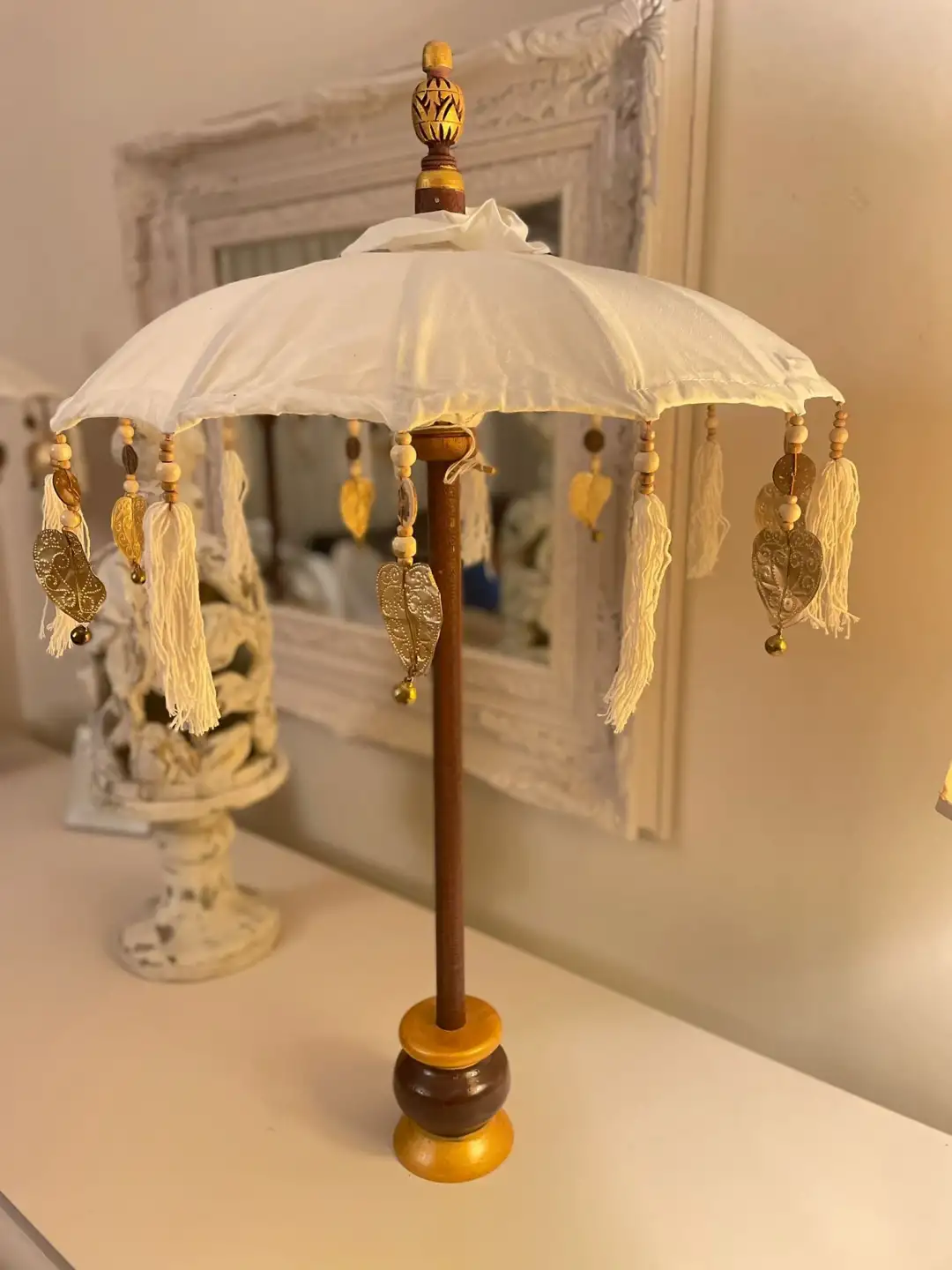 Bu mini Bali parasol, masa üstü, sehpa, raf veya köşe dekorasyonu için mükemmel. Salon, yatak odası, balkon, teras, bahçe, havuz veya ofisinizde tropikal bir hava yaratır. Hem dekoratif obje hem de hafif gölgelik olarak kullanılabilir. Tamamen el yapımı olduğu için her parça benzersizdir – küçük el işçiliği izleri doğal charm'ını artırır.