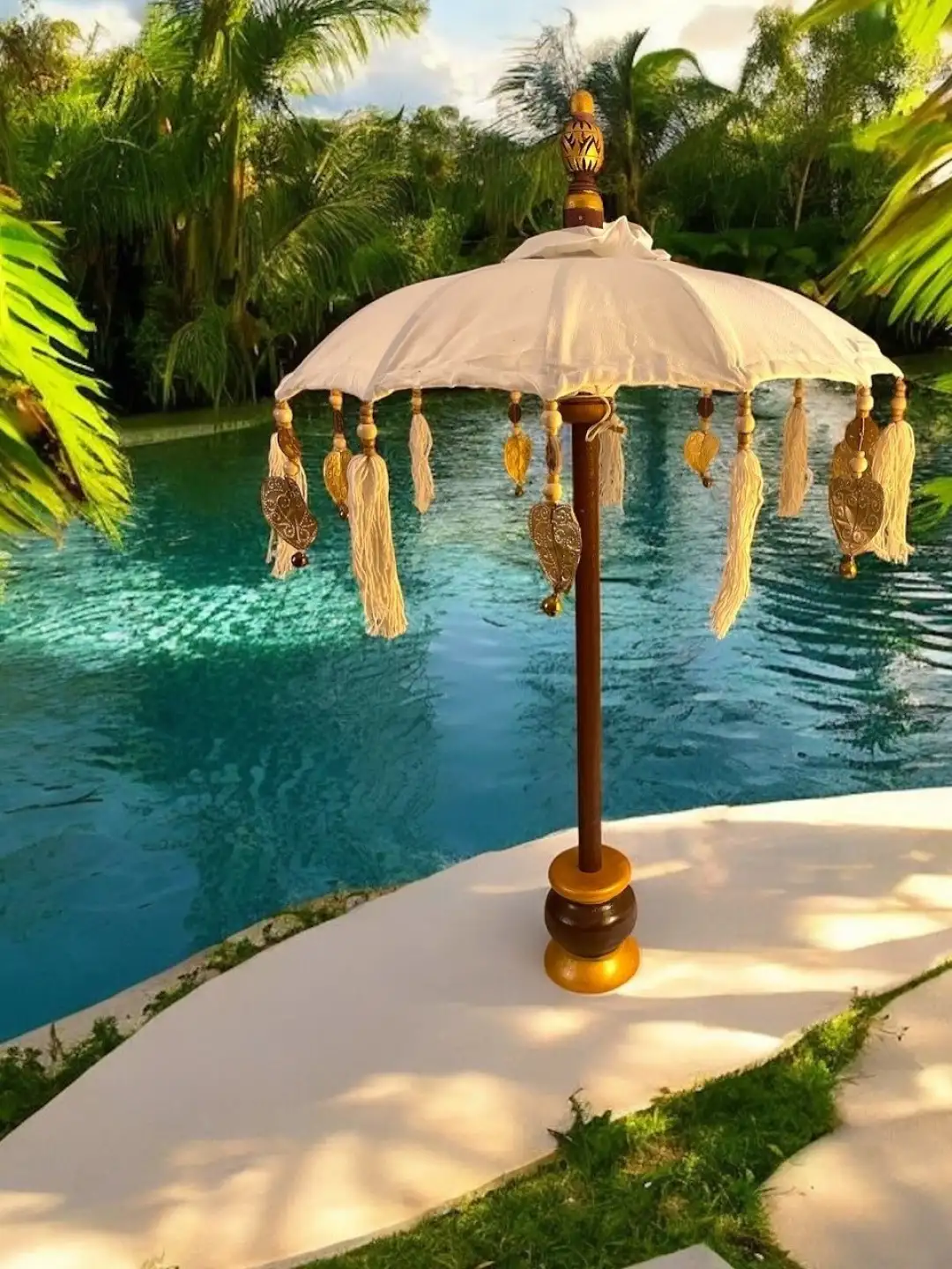 Evinize egzotik bir Bali esintisi katın! Bu zarif dekoratif Bali şemsiyesi, krem rengi keten kumaşı ve doğal ahşap gövdesiyle bohem ve etnik dekorasyon sevenler için ideal bir parça.