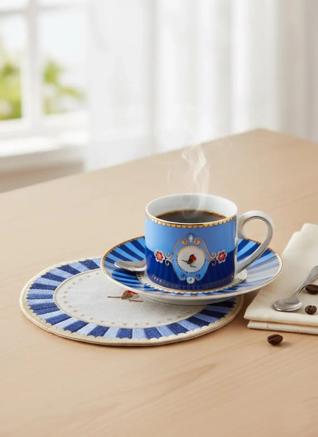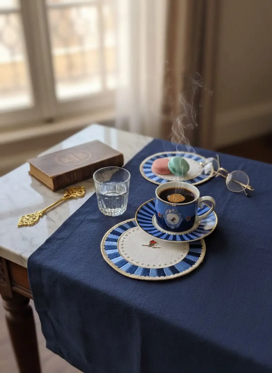 Sunumlarında kaliteye ve estetiğe önem verenler için tasarlanan 2 adet mavi nakışlı kuş desenli yuvarlak peçete, sofralarınıza zarafet getiriyor. İnce işçilikle işlenmiş kuş motifi ve etrafındaki altın rengi puan detayları, her bir parçayı özel kılıyor.